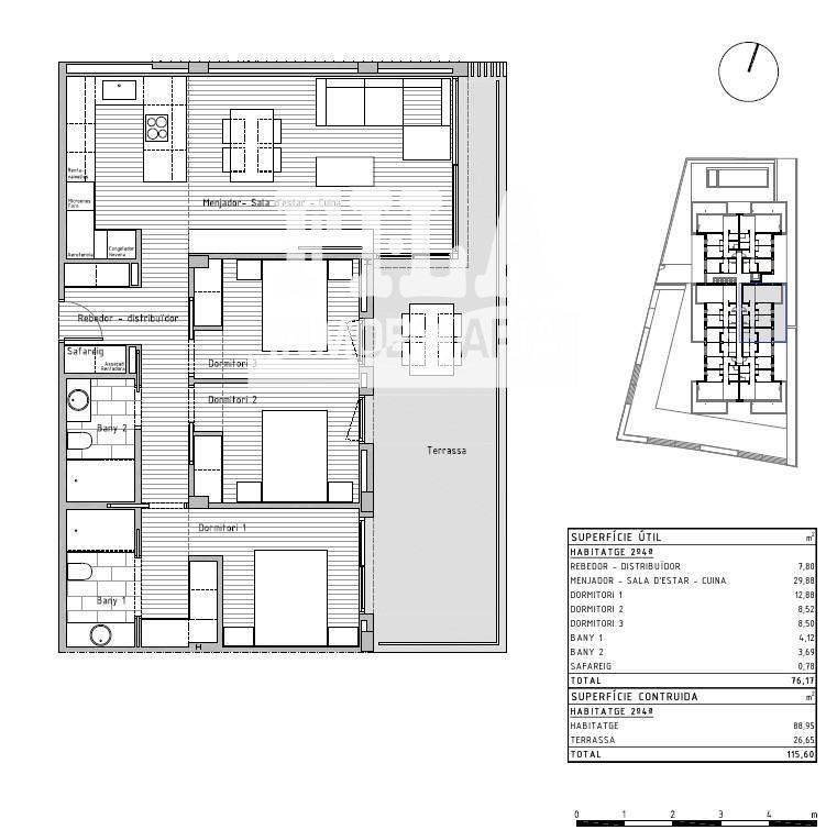 Si desea vivir en un entorno privilegiado cerca de todos los servicios no deje escapar esta oportunidad venga a visitar esta nueva construcción de un edificio plurifamiliar compuesto por 24 viviendas situado en la localidad de Cunit. .Este bloque de nueva construcción ha sido diseñado con un enfoque en la elegancia moderna. Cada piso ha sido meticulosamente diseñado para maximizar el espacio y la luz, creando un ambiente acogedor y atractivo y con los más altos estándares de calidad. Desde los acabados interiores hasta los electrodomésticos de alta gama, como cada pequeño detalle, garantizando la máxima satisfacción para del propietario..Con una superficie construida total de 115,60 m2 de vivienda, y 88,95 m2 construidos interior de vivienda se encuentra distribuidos 3 amplias habitaciones (1 de ellas suitte), salón comedor con cocina americana de 31,43 m2 totalmente equipada con todos los electrodomésticos, 2 baños completos, 1 lavadero con los electrodomésticos integrados de lavadora y secadora marca BALAY, recibidor, terraza de 26,65 m2, suelos porcelanamicos en toda la vivienda, carpintería exterior de aluminio de color gris claro de perfil eficiente y con rotura de puente térmico, carpintería interior con puertas correderas lacadas en blanco..Además, contamos con zona comunitaria con piscina, ascensor y plazas de parking opcionales. .El entorno y municipio:.Cunit se encuentra situado en la comarca del Bajo Penedés y en la provincia de Tarragona aunque está incluido en la tercera corona de la región urbana de Barcelona. Limita con Segur de Calafell (localidad del municipio de Calafell), de la misma comarca, así como con Cubellas, en la comarca del Garraf, y Castellet y Gornal, en la comarca del Alto Penedés, ambos de la provincia de Barcelona..Su paisaje es típicamente mediterráneo, desde los 2,5 km de playas de arena fina, protegidas por los espigones que le proporciona sus formas semicirculares características, pasando por las planicies agrícolas (denominadas Prats de Cunit i Plana del Castell) hasta las sierras del centro (Sierra de Sant Antoni) y norte del municipio, siendo parte de las últimas montañas de la sierra litoral catalana...